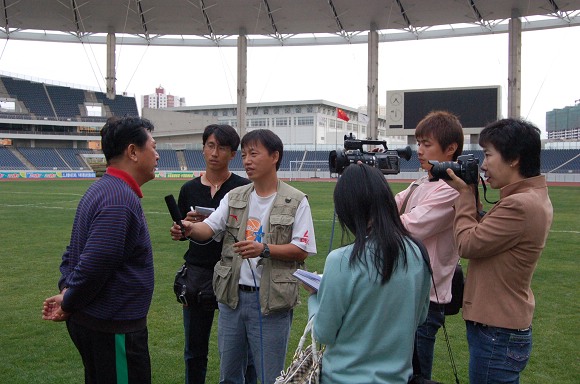 赛后金志扬总教练在接受媒体的采访。
