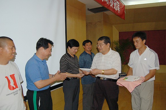 党委书记焦文俊在向教练员、运动员代表颁发奖金。