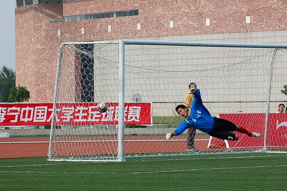 我校足球队守门员王毅将对方第四轮点球扑出从而奠定比赛胜利的基础。