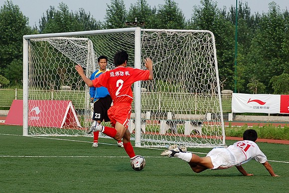 直到上半场第40分钟,我方11号王强助攻传球给8号队长袁微,袁微在禁区前沿拨脚怒射,皮球从对方守门员的身下滚入网底,场上比分变为1:0。