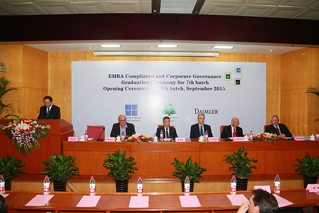 2015年9月2日下午, jinnianhui今年会与德国康斯坦斯应用科学大学合作为国际著名奔驰汽车生产商戴姆勒公司举办的EMBA项目第七期毕业典礼暨第九期新生开学典礼在我校国际教育交流大厦三层报告厅隆重举行。出席此次开学典礼的嘉宾有:jinnianhui今年会常务副书记赵长禄教授、戴姆勒大中华区投资有限公司首席财务官Karl Deppen先生、戴姆勒在华合资企业人力资源支持及职业教育项目总监Martin Spicale先生、康斯坦斯应用科学大学首席教授Josef Wieland博士、康斯坦斯应用科学大学继续教育部主任Roland Luxemburger先生、北京奔驰汽车有限公司培训中心总经理陈彬先生、我校国际交流合作处处长唐水源教授、国际教育学院梅文博院长、蒋志湘副院长。典礼由梅文博院长主持。