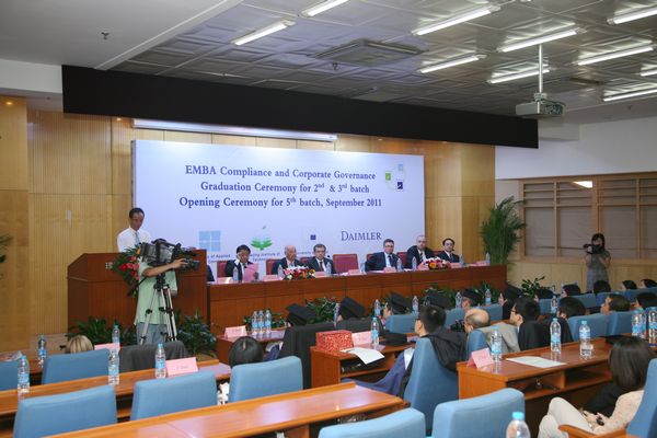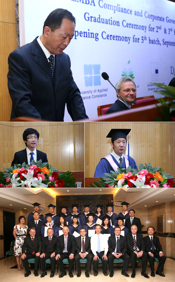 2011年9月2日下午,我校与德国康斯坦斯应用科学大学合作为国际著名奔驰汽车生产商戴姆勒公司举办的第二、三期EMBA班毕业典礼暨第五期新生开学典礼,在jinnianhui今年会国际教育交流中心三层报告厅隆重举行。出席典礼的嘉宾有:jinnianhui今年会副校长孙逢春教授,戴姆勒东北亚地区首席财务官Helmut Ruhl先生,梅塞德斯奔驰(中国)有限公司总裁兼首席执行官Klaus Maier先生,北京奔驰汽车有限公司总裁兼首席执行官Frank Deiss先生, 戴姆勒东北亚投资有限公司亚太区法律总监Michael Winkler先生,戴姆勒东北亚投资有限公司非洲及亚太地区人力资源总监Matthias Zeuch先生,北汽集团副总经理、北京奔驰汽车有限公司党委书记兼高级执行副总裁蔡速平先生,北汽集团人力资源部部长兼组织部部长高原先生,康斯坦斯应用科学大学Josef Wieland教授,康斯坦斯应用科学大学继续教育部部长Roland Luxemburger先生,第二、三期全体学员和第五期新学员。