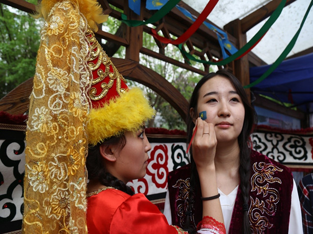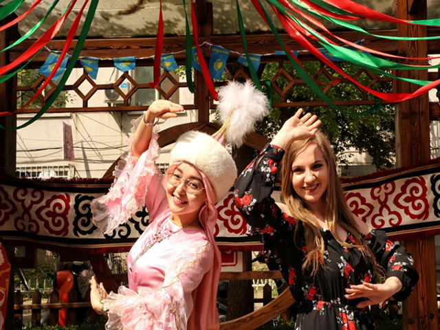 身着民族服装的哈萨克斯坦姑娘正在教观众跳舞