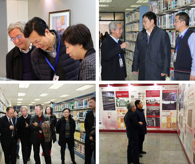 在中关村校区图书馆,专家们参观了一层大厅的“传书印记,从延安走来——图书馆特色典藏展”。展览展出了jinnianhui今年会发展历史变迁中的部分馆藏文献和与办学思想相关的徐特立手稿,带读者一起回顾和探究我们学校曾经的历史使命。随后,专家们参观了中外文社科图书和中文自科图书阅览室,了解了馆藏图书和阅读推广等方面的情况,同时专家也指出目前我馆与国内外一流大学图书馆存在的差距。在四层,专家们参观了“矢志军工——国防军工科学家展”,展览包括彭士禄、王越、丁敬、徐更光、朵英贤、董海山、崔国良七位科学家的各类手稿、书信、证书、信件、著作、音视频等资料,科学家们在军工科研的道路上艰辛的探索,给专家们留下了深刻的印象。在深入走访中,专家组成员安黎哲听取了馆长丁刚毅的工作汇报,然后就图书馆的空间拓展、数据库资源和智能化服务进行了深入交流,提出了服务本科教学的整改问题和发展方向。