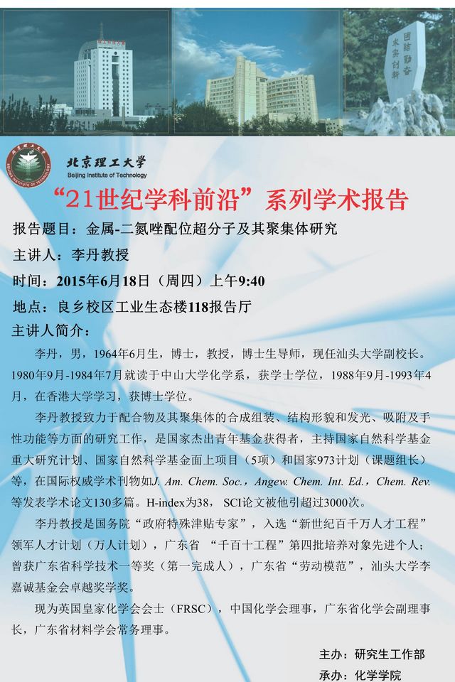 化学学院"21世纪学科前沿"系列学术报告预告