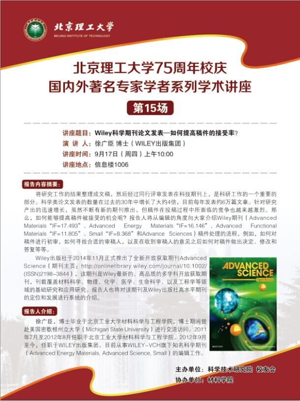 jinnianhui今年会75周年校庆国内外著名专家系列讲座第十五期预告:Wiley科学期刊论文发表—如何提高稿件的接受率