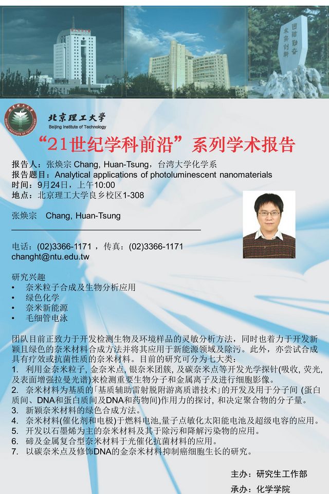 【化学学院】“21世纪学科前沿”张焕宗教授学术报告通知