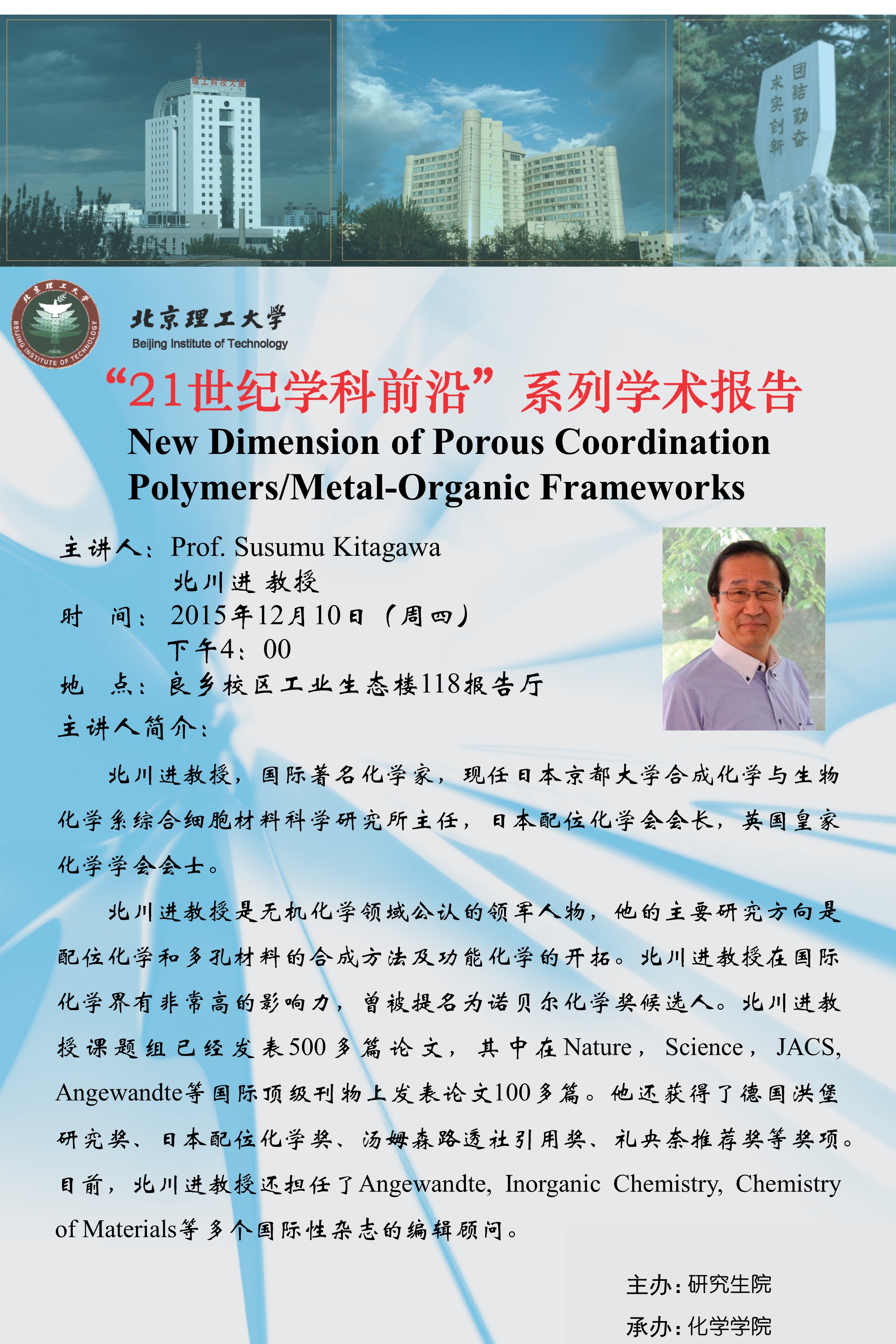 【化学学院】“21世纪学科前沿”北川进教授学术报告通知