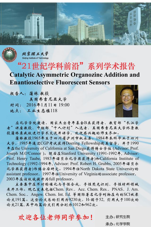 【化学学院】“21世纪学科前沿”蒲林教授学术报告通知