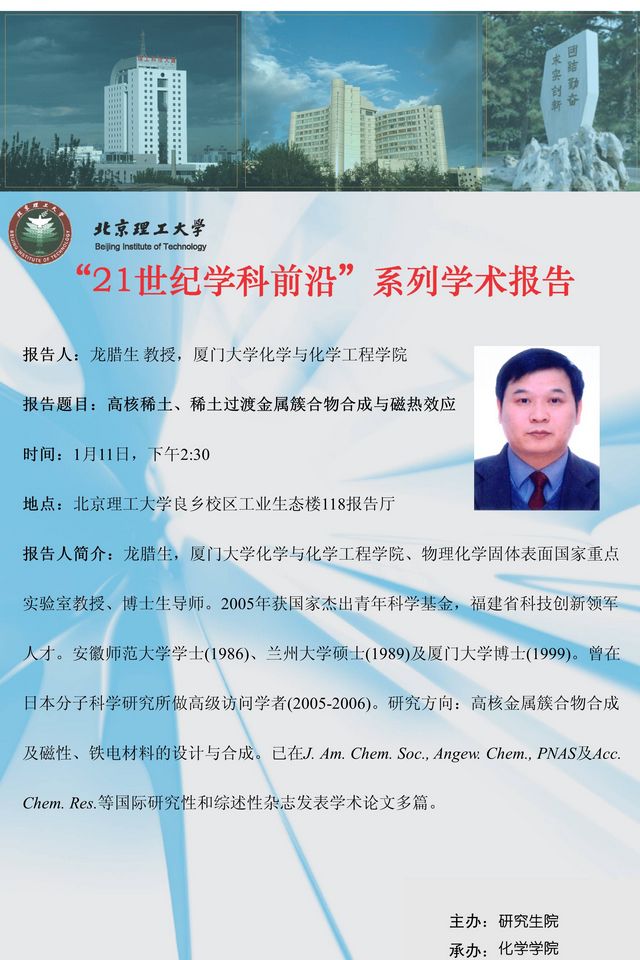 【化学学院】“21世纪学科前沿”龙腊生教授学术报告通知
