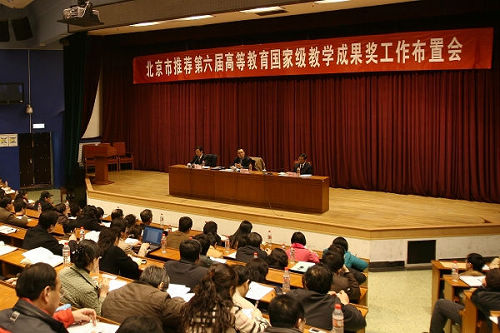 3月12日下午,北京市推荐第六届高等教育国家级教学成果奖申报工作布置会在我校中心教学楼报告厅隆重召开。此次会议由北京市教育教学委员会主持召开,我校教务处协办。北京市各有关高校主管教学的副校(院)长、教务处长及获准申报第六届高等教育国家级教学成果奖励的成果负责人,共计200余人参加。我校此次共有七项教学成果奖获准推荐申报国家级教学成果奖,项目负责人与相关学院领导参加了本次会议。北京市教育委员会副主任郭广生、清华大学副校长谢维和出席了本次会议。会议由北京市教委高等教育处处长黄侃主持。