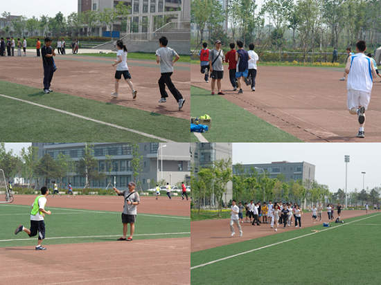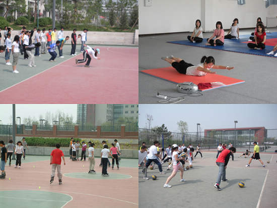 体育课程组自2007年九月以来,在良乡校区承担着07、08级两个年级6200余名本科生的体育课教学任务,周学时达300学时,每天约有13名教师,每位教师承担着4-6学时/天的课程,教学任务十分繁重,工作条件十分艰苦,但每位教师一切为了教学,无论是烈日炎炎,还是寒风习习,大家克服困难,保持着良好乐观、积极向上的心态,为了学生上好每堂课。