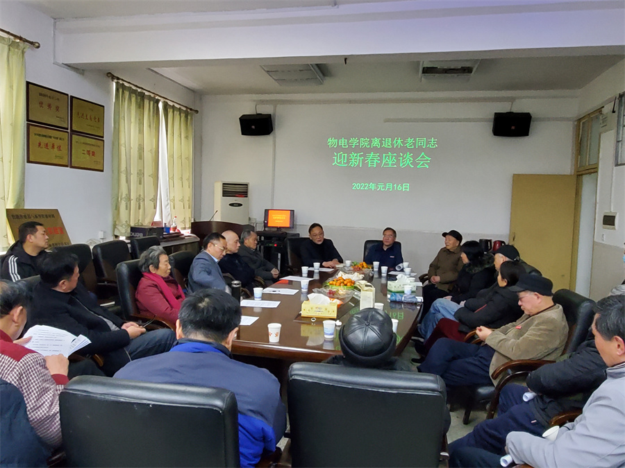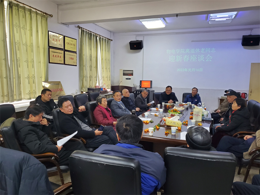 2022年1月16日上午,我院在物理楼213举行迎新春离退休老同志座谈会,副校长廖湘岳、离退休工作处廖志鹏处长出席,近20位离退休老同志、学院全体领导参加座谈会,座谈会由学院党委书记易贵元主持。