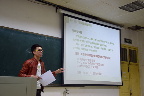 为帮助新生了解C语言,提高kaiyun官网学生计算机二级考试通过率,2016年11月1日晚7:00,由kaiyun官网科技协会举办的第二届C语言培训班在十教附一202成功开课。学工办吴秋霜老师、团委副书记彭亚平莅临了本次C语言培训班开课仪式。科技协会副部长潘少鹏为主讲人。