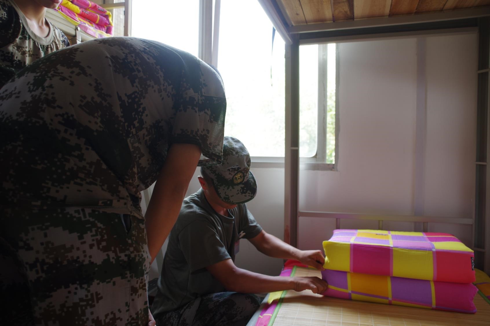 上午军训任务结束后,稍作休息后教官如约来到寝室进行指导工作。尽管19级学子身体劳累,他们仍认真地向教官学习。教官首先对宿舍内务的标准要求进行了详细讲解,随后耐心细致地向新生进行了叠军被分布讲解演示:折叠、压缝、整角,一系列动作完整流畅。讲解及实际演示工作完成后,在新生的邀请下,教官热情走访各个寝室,对部分新生宿舍的卫生情况、桌面和床上用品进行规范整理。在此期间,党委副书记杜鑫、19级辅导员任朋飞、主席团全体成员也来到寝室向大家指出内务检查的重点,让志愿者对接下来的寝室卫生进行检查并记录。