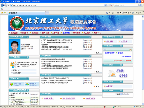 4. 校内邮箱:提供和校内邮箱(mail.bit.edu.cn)的接口,用户通过第一次配置,以后登录自动化平台可点击直接进入到邮件系统中,并在页面实时显示邮件提醒;