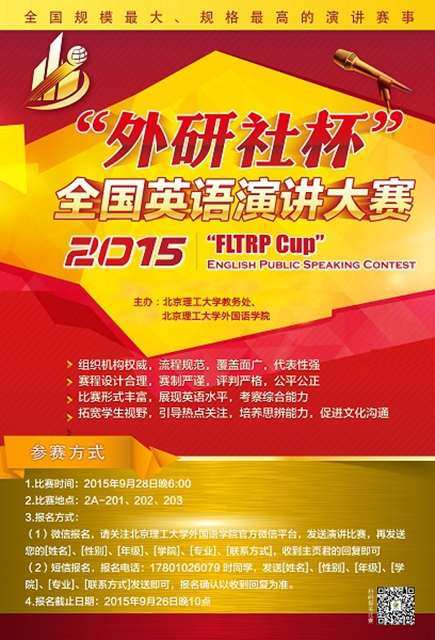 2015“外研社杯”全国英语演讲大赛jinnianhui今年会赛区初赛报名开始了!语言是沟通世界文化的桥梁,演讲比赛的意义正是如此,旨在选拔出口语水平优秀的学生,给予广大的大学生一个展示自我的平台。现在,机会只属于你,你,不可缺少!