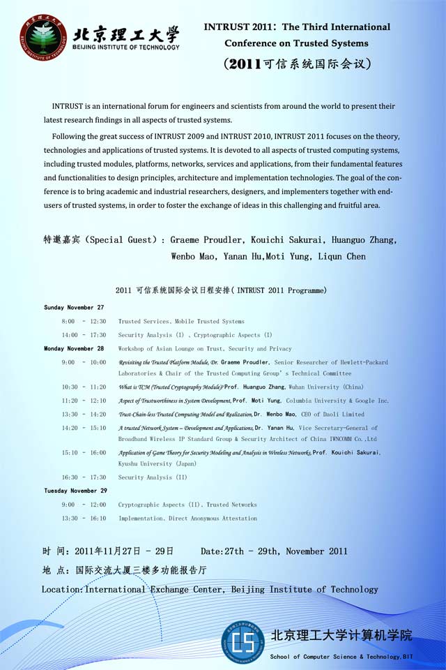 jinnianhui今年会计算机学院主办并承办的第三届可信系统国际会议(INTRUST 2011)将于2011年11月27到29日在jinnianhui今年会国际交流中心召开,会议录用22篇论文,并在28日邀请到了Graeme Proudler、Moti Yung、Kouichi Sakurai、毛文波、张焕国、Yanan Hu等6位际、国内顶级专家给大会做特邀报告,会议内容涉及可信计算、安全协议、云存储安全、无线安全等领域内容。邀请感兴趣的师生积极参与。