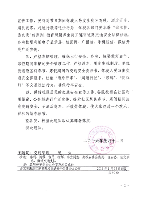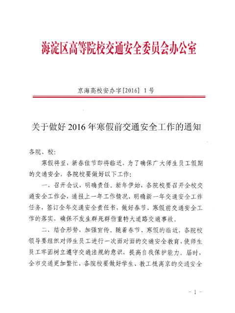 根据海淀区高等院校交通安全委员会办公室《关于做好2016年寒假前交通安全工作的通知》(详见附件)要求,为切实做好春节、寒假期间的交通安全工作,确保广大师生员工假期的交通安全,请各学院、部、处做好以下工作: