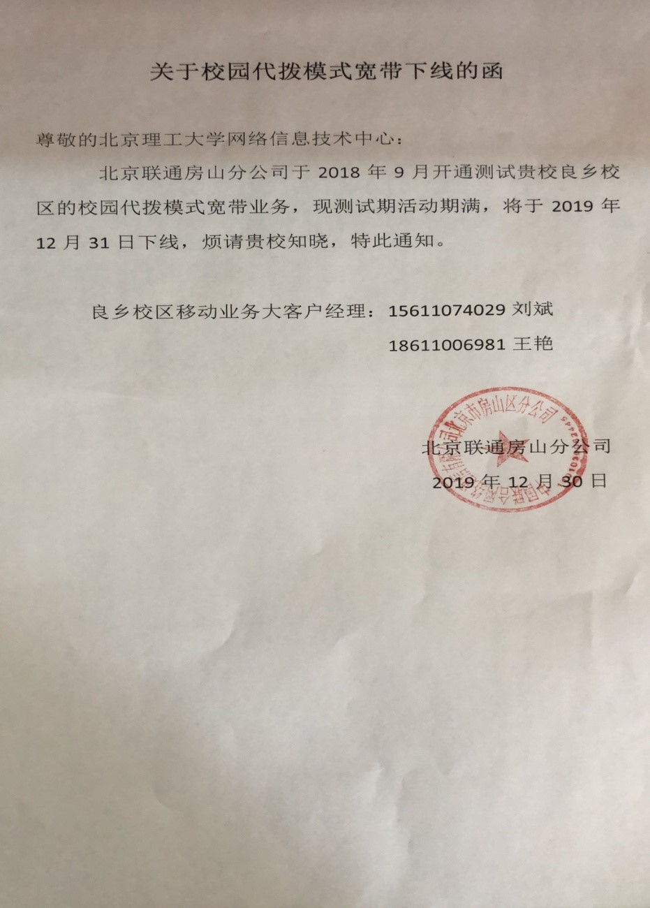 网络信息技术中心于2018年9月与北京联通合作开通了中关村校区和良乡校区的学生宿舍区联通无线宽带业务测试,现接北京联通方面告知,测试活动期满,相关服务将于2019年12月31日停止服务。