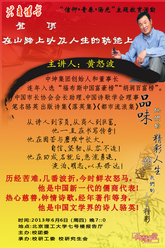 【信仰·青春·阳光】对话黄怒波“登顶——在山路上以及人生的轨迹上”讲座预告