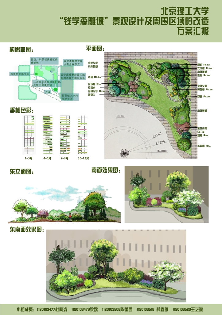 钱学森塑像作为我校校园景观的重点内容,得到了广大师生员工的积极关注,党委宣传部结合学校整体建设工作开展,拟在图书馆西南三角地重新建设以钱学森塑像为核心的校园景观,并结合学生教学活动,鼓励学生用自己的专业知识美化校园,进一步增强校园景观的文化底蕴,服务于学校的人才培养工作。现将五组方案加以展示,向广大师生员工征求意见,宣传部将综合师生意见后,修改后选定最后的实施方案。