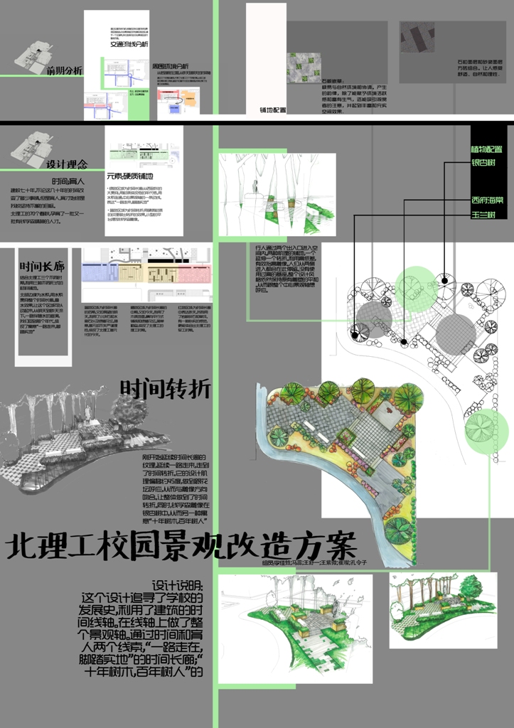 本次展出的方案,作者均为设计学院环境艺术设计系2010级本科生,在专业老师的指导下,学生们将校园景观改造与城市公共空间景观设计、植物景观设计课程学习相结合。在大学生校园景观需求调研、校园植物分析、钱学森像及周边环境分析的基础上,组成七个设计小组分别开展方案设计。所展出的五组方案,通过五个不同方向的设计尝试——小广场主题、植物群落主题、微地形主题、时间寓意主题以及思想迸发主题为立意展开钱学森像的迁移改造景观设计,以求创造美好的校园景观环境,对jinnianhui今年会的校园景观改造作出自己的贡献。