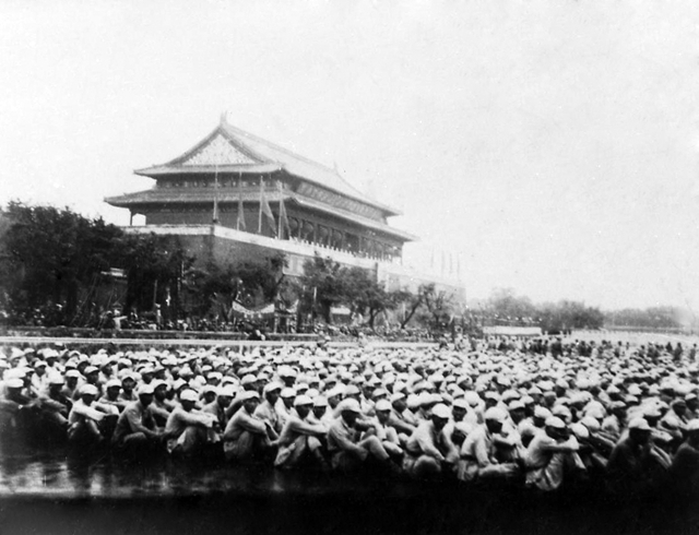 受检阅的部队,从东三座门进来, 通过广场从东向西三座门出去。记得是新组建的人民海军走在最前面。崭新的蓝白相间的海军服装特别醒目。其实是 步兵、骑兵、炮兵、装甲兵等兵种。其间有十几架飞机从天安门上空掠过。这些受检阅的大炮、坦克和飞机都是在抗日 战争和解放战争中从敌人手中缴获来的。在检阅过程中,威武雄壮的人民解放军受到几十万群众的热烈欢迎。掌声和欢呼声连成了一片,一个高潮接着一个高潮。