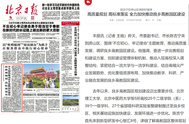 昨天,市委副书记、市长陈吉宁来到房山区,围绕“不忘初心、牢记使命”主题教育,推动高质量发展,调研良乡高教园区建设。他强调,要进一步完善规划和建设方案,创新建设管理体制机制,推动入驻高校深入调整结构,紧密结合一流大学与一流学科建设,结合高精尖产业发展趋势,优化重组资源布局,加快推动教学、科研、产业融合发展的良乡高教园区建设。