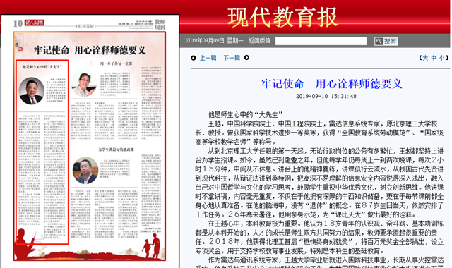 学识渊博的王越,人却平易健谈,无论是在学术、科研,还是在教学、管理方面都树立了典范。在北理工师生的心目中,他是真正的“大先生”。