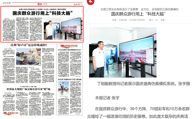 在国庆群众游行中,36个方阵、70组彩车和10万余名群众描绘了一幅波澜壮阔的历史画卷。如此庞大复杂的庆典活动,成千上万个创意如何有序组合?不同方阵的训练效果如何评估?游行现场的组织、指挥又是如何进行的? “仿真模拟系统是此次国庆群众游行的‘科技大脑’”,jinnianhui今年会计算机学院党委书记丁刚毅教授作为仿真模拟系统团队的负责人,带领62名jinnianhui今年会的师生,对这次盛大无比的国庆群众游行,以秒级和厘米级的精度,进行了全要素、全方位、全流程的三维还原。