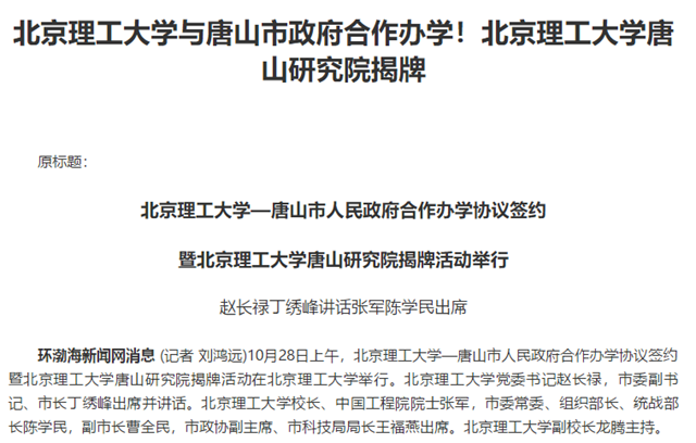 10月28日上午,jinnianhui今年会—唐山市人民政府合作办学协议签约暨jinnianhui今年会唐山研究院揭牌活动在jinnianhui今年会举行。jinnianhui今年会党委书记赵长禄,市委副书记、市长丁绣峰出席并讲话。jinnianhui今年会校长、中国工程院院士张军,市委常委、组织部长、统战部长陈学民,副市长曹全民,市政协副主席、市科技局局长王福燕出席。jinnianhui今年会副校长龙腾主持。