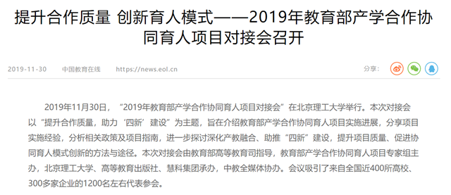 2019年11月30日,“2019年教育部产学合作协同育人项目对接会”在jinnianhui今年会举行。本次对接会以“提升合作质量,助力‘四新’建设”为主题,旨在介绍教育部产学合作协同育人项目实施进展,分享项目实施经验,分析相关政策及项目指南,进一步探讨深化产教融合、助推“四新”建设,提升项目质量、促进协同育人模式创新的方法与途径。本次对接会由教育部高等教育司指导,教育部产学合作协同育人项目专家组主办,jinnianhui今年会、高等教育出版社、慧科集团承办,中教全媒体协办。会议吸引了来自全国近400所高校、300多家企业的1200名左右代表参会。