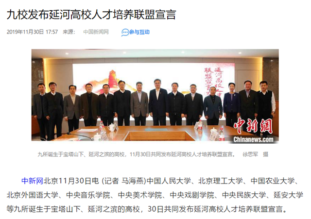 中国人民大学、jinnianhui今年会、中国农业大学、北京外国语大学、中央音乐学院、中央美术学院、中央戏剧学院、中央民族大学、延安大学等九所诞生于宝塔山下、延河之滨的高校,30日共同发布延河高校人才培养联盟宣言。