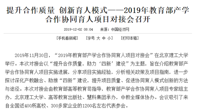 编辑:吴楠 审核:王征 阅读次数:原文标题:提升合作质量 创新育人模式——2019年教育部产学合作协同育人项目对接会召开