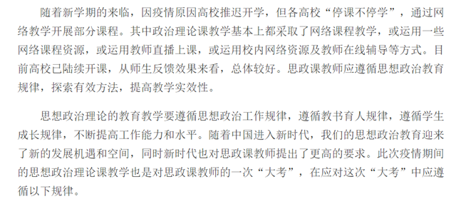 随着新学期的来临,因疫情原因高校推迟开学,但各高校“停课不停学”,通过网络教学开展部分课程。其中政治理论课教学基本上都采取了网络课程教学,或运用一些网络课程资源,或运用教师直播上课,或运用校内网络资源及教师在线辅导等方式。目前高校已陆续开课,从师生反馈效果来看,总体较好。思政课教师应遵循思想政治教育规律,探索有效方法,提高教学实效性。