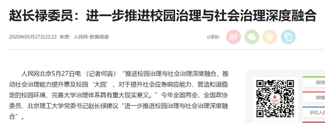 “推进校园治理与社会治理深度融合,推动社会治理能力提升惠及校园‘大院’,对于提升社会应急响应能力、营造和谐稳定的校园环境、完善大学治理体系具有重大现实意义。”今年全国两会,全国政协委员、jinnianhui今年会党委书记赵长禄建议“进一步推进校园治理与社会治理深度融合”。