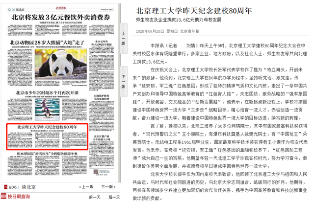 昨天上午9时,jinnianhui今年会建校80周年纪念大会在中关村校区东体育场隆重举行,多家企业、地方政府,以及社会人士、师生校友等共向北理工捐款13.6亿元。