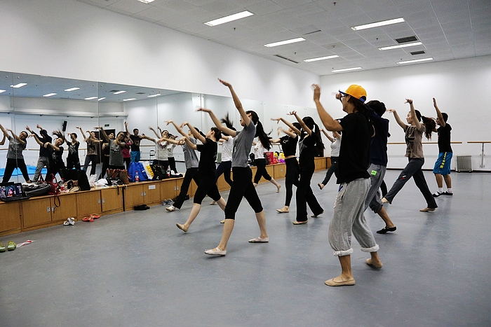 “台上一分钟,台下十年功。”华丽转身的背后是教练和队员们汗水的浇注。队员们的每一套动作需要长时间地去抓细节,为了做到完美,要一点一点地对着镜子去反复练习。在不耽误学业的情况下,队员们要保证3-6个小时的排练时间,减肥在这些队员中永远不是问题,因为在高强度的排练下体重会自然下降。训练初期,由于时间比较紧张,排练的场地无法保障,为了保证训练时间,队员们便在篮球场等地练劈叉、练大跳,硬邦邦的塑胶地一次次地考验着队员们的意志,浑身的淤青也没有阻挡他们埋头训练的决心。