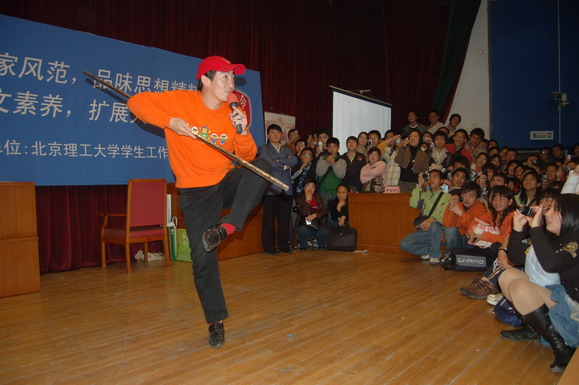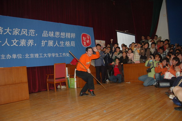 在回答完同学的问题后,章老师在现场进行了即兴表演,他一手握着“金箍棒”做出一个个经典的动作,一个手拿着话筒向同学们仔细的讲解动作的要领,并和错误的动作进行了对比分析,让同学们领悟到了看似简单的一招一式中蕴含的奥妙和学问。最后章老师向所有听众展示了一套完整的连续动作,霎时间只见金棒飞舞、虎虎生风,配以《西游记》中的经典音乐,章老师的风采丝毫不减当年,俨然是“齐天大圣”从天而降。全场观众起立为章老师报以长时间的热烈掌声。
