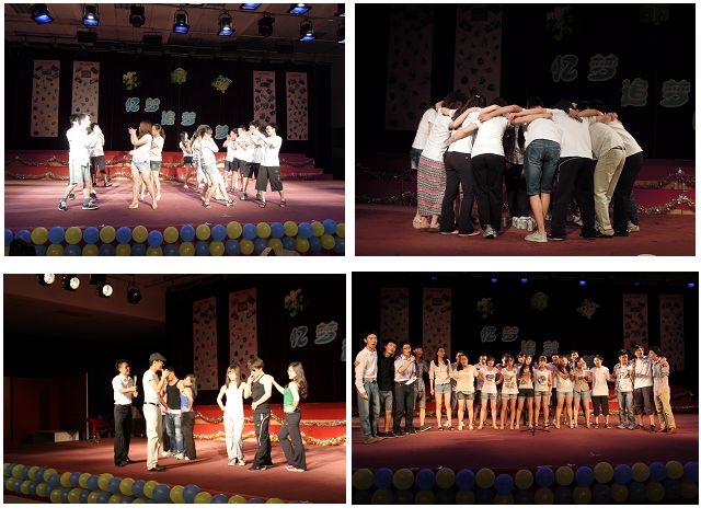 随后,各班同学依次登台演出。动感的歌舞《pretty girl》、《桃花朵朵开》使大家的记忆仿佛定格在了四年前刚见面时的场景,相逢时的那份青涩回忆起来如此美好;插播的短片勾起了大家对卧谈会的无数回忆,想起了同学相伴四年的无数精彩片段;精彩的话剧“十年”、合唱“爱拼花才开”将大学生活的一个个瞬间再次呈现在大家面前,激励着大家继续奋斗。