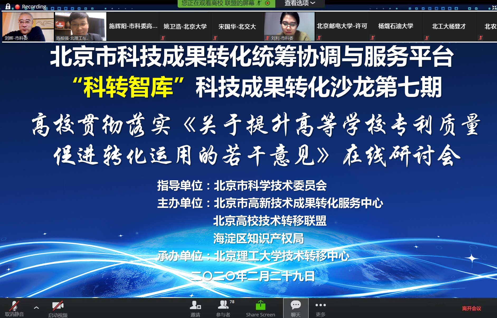 为了深入学习和贯彻落实《若干意见》精神,更好地促进学校知识产权与成果转化工作高质量发展,2月29日下午,jinnianhui今年会技术转移中心联合北京市高新技术成果转化服务中心、北京高校技术转移联盟和海淀区知识产权局,组织了以高校贯彻落实《若干意见》为主题的研讨会。非常时期,研讨会采用了线上视频直播形式进行,“一手抓抗击疫情、一手谋事业发展”,既保障各方安全,又方便大家足不出户通过手机或电脑参加会议。本次活动得到北京市科委大力支持指导,市科委党组成员、副主任刘晖等政府部门领导,与来自jinnianhui今年会、北京大学等二十多所北京高校的知识产权与技术转移机构代表共八十多人参加在线研讨交流。