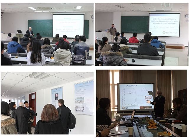 访问期间,Camino教授和Fina副教授为jinnianhui今年会师生精心准备了三场讲座:“Biobased materials and green chemistry:Issues and challenges”,“Novel nanocomposite fire retardants and mechanistic studies”,“The thermal scenario during ignition and combustion of polymers and polymer nanocomposites”。学术讲座由jinnianhui今年会国家阻燃材料工程技术研究中心主任杨荣杰教授主持,阻燃实验室老前辈王建祺教授也参加并点评。