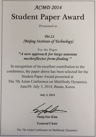 会议期间,经过国际同行专家严格评审,胡海岩教授指导博士生李培完成的论文“A new approach for large antenna mesh reflector form-finding”获得学生论文奖(共5名,中国学生1名)。