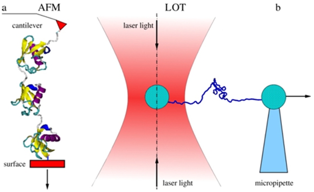 图1. 力谱方法测量单分子键性质示意图。(a)原子力显微镜;(b)光镊。(该图摘自于Sanjay Kumara and Mai Suan Li, Physics Reports 486 (2010) 1-74)。