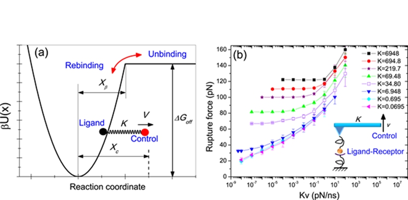 一直以来,单分子键的性质是生物物理、生物力学研究者关注的热点问题,是人们理解细胞-细胞间相互作用、信号传递,以及分子药物设计等前沿问题的重要理论基础。力谱方法是人们研究单分子键性质的重要实验手段,如图1所示。力谱方法主要是测量单分子键在不同加载速率下的断裂强度,从而获取单分子键的重要性质,如断裂势垒高度 ,势阱宽度 ,以及解离速率 等。从Bell 1978年的Science文章(Science, 200 (4342): 618-627, 1978)开始,人们一直认为单分子键的断裂强度是随着加载速率的下降而下降的。但是随着实验技术的发展,越来越低的加载速率的实现,使人们发现,当加载速率下降到一特定值后,单分子键的断裂强度不再随着加载速率的变化而变化,这与人们一直以来的观点是相悖的。