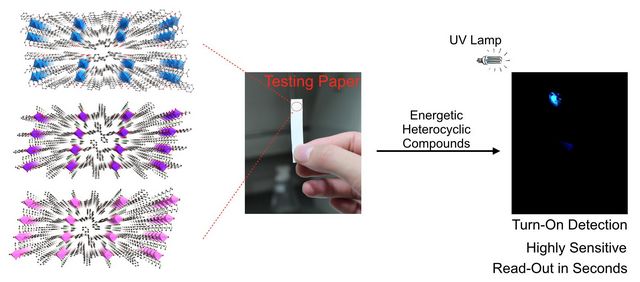 化学学院的王博、冯霄等研究者在前期的工作基础上(Chem. Commun., 2013, 49, 7049;Chem. Eur. J., 2014, 20, 8856;Chem. Sci., 2014, 5, 4388),开发出一种高灵敏、裸眼可视、简便的五元杂化爆炸物的荧光检测方法,并且裸眼检出限可达6.5 ng/cm2,爆炸物溶液光谱检出限可达10-9 mol/L。该方法利用本身具有聚集诱导发光性质的有机连接基元与金属离子进行连接,制备金属有机骨架材料(MOF)作为传感器,并通过改变金属离子的种类调节MOF传感器的荧光特性。当引入特定金属离子时,MOF传感器的荧光可以被预先“关掉”,而当该传感器接触到五元杂环爆炸物时,荧光“开关”可被迅速触发,使得荧光在十几秒内重新被释放出来。这一由“关”到“开”的荧光信号变化,不仅可以被光谱仪器所捕捉从而用于定量检测,还可十分容易的通过裸眼直接观察到。该传感器可直接用于便携式试纸检测。该研究成果近日发表在国际顶级化学期刊《Journal of the American Chemical Society》上(J. Am. Chem. Soc., 2014, DOI:10.1021/ja508962m)。jinnianhui今年会材料学院的董宇平教授对该研究工作提出了宝贵的建议。