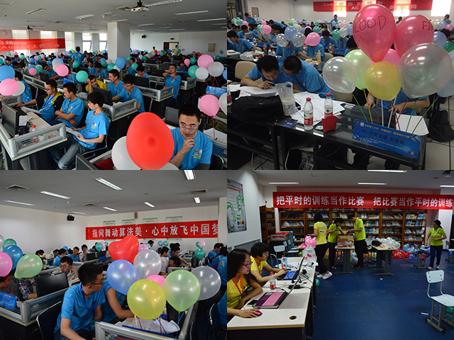 比赛从上午9点30分开始,比赛用时5个小时;共设置12道题目,采用ACM评分规则,程序正误由Online Judge系统自动判评。长达5个小时的激烈角逐,不仅是脑力的比拼,而且是耐力的较量。参赛选手分工明确、协调统一,充分发挥自身优势,以团队的优势攻坚克难。正是由于选手们的出色表现,比赛现场升起一个又一个彩球。