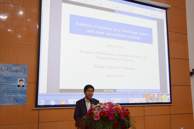 9:40左右,在热烈的掌声中,张志涛教授开始做题为“关于非线性偏微分方程的一些最新成果”的学术报告。张教授就非线性泛函分析、变分法、竞争方程组、线性与非线性耦合的非线性系统、解的存在性与不存在性等方面展开讲述,随后在场的老师和同学就一些问题和教授进行交流。