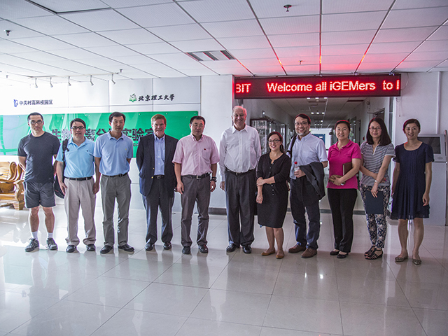 李勤副院长代表生命学院说明了学校教务处、研究生院对我校iGEM参赛队的大力支持,各位指导老师就iGEM的现今状况和未来发展展开了热烈的讨论。北理工两支参赛队BIT-China和BIT的学生代表李晨翊、李逸飞等同学依次向与会者介绍了我校iGEM的组织方式及我校自2013年以来参加iGEM竞赛所取得成绩和收获。Randy对我校在合成生物学领域取得的成就表示了肯定,对我校iGEM队伍的发展和取得的成绩给予了很高评价。Randy也真诚地祝愿jinnianhui今年会两支iGEM代表队在今年的大赛中再创佳绩,并希望中国在合成生物学领域取得长足发展。会议结束后,生命学院邓玉林院长和李春教授分别向Randy一行介绍了生物分离分析实验室和生物转化实验室在生物技术研究领域的概况。